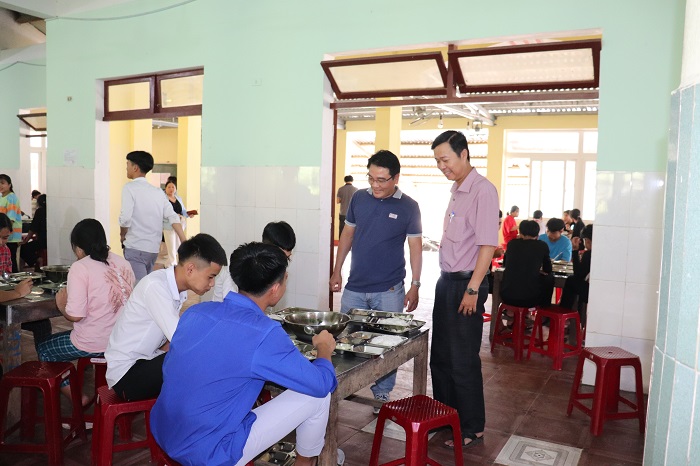 Đoàn ủng hộ đã đến tham quan các công trình phụ, khu sinh hoạt nội trú, khu vực bếp ăn, nhà ăn của trường. Nhân đây, Đoàn ủng hộ thấu hiểu, chia sẻ với những khó khăn của nhà trường, mong muốn việc đầu tư các trang thiết bị học tập, nâng cao chất lượng khẩu phần ăn góp phần giúp các em được hưởng các chính sách hỗ trợ của nhà nước, đảm bảo điều kiện học tập, tăng cường trang bị dạy học; tạo môi trường an toàn lành mạnh thân thiện trong trường, xã hội đồng thời đảm bảo dinh dưỡng, nâng cao thể lực, thể chất cho các em.